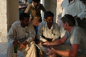 Alors que nous traversons la premiere petite ville a quelques kilometres de la frontiere, tous les hommes (ce sont principalement des hommes que l'on voit dans la rue...) relevent les tetes et nous helent la bienvenue. Tous ensemble, ils forment presqu'une chorale... Quelques kilometres plus loin, 2 pakistanais sur leur scooter nous suivent en nous posant d'incessantes questions. Apres quelques minutes, ils veulent que nous nous arretions pour boire un coup: "brother Michael, sister Yvoine, allons boire un pepsi!" Nous nous voyions refuser, trempes que nous sommes, de peur de prendre froid en s'arretant. Ils s'arretent donc sans nous, a grands coups de "bye bye brother Michael and sister Yvoine". Nous continuons mais pas moins de 2 minutes plus tard, les revoila... Explication: "miss, I missed you so much, so no pepsi!" (miss, tu me manquais deja tellement, donc pas de pepsi!).