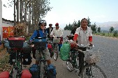 | 29 march / 24 april 05  Wow! We did not know what to expect but our arrival into China (in the Yunnan Province, Southern China) takes our breath away: China is at work! As Mike exclaims as soon as we get there: "when 10 Laos are asleep under a tree, the Chinese have an impact on their environment!" As we slowly ride up a dirt road, in the middle of the mountains of northern Laos, surrounded by nothing but native forest and Chinese road workers, the crossing of the border line is a visual shock: large concrete road, big, multi-coloured hotels and buildings, in particular lemon yellow and lolly pink (we feel like we've arrived in a Walt Disney cartoon), men and women going in all directions, doing what they have to do... Some build, some cook, others work in the paddocks, transport, play pool, smoke while filling up their truck with fuel, open the shops... Incredible, it is like we have arrived in the middle of an ant mount! And no kids around?! They are also at work: at school!  So we go from the quiet mountains of Northern Laos, scattered with a few villages here and there, to the cultivated, worked, transformed by men mountains of Southern China. China (or at least Yunnan) seems to have clear objectives in mind and nothing will move it from working towards them. Let's get to work!  |